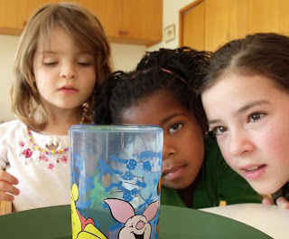 The girls got to see the "skin" on top of water today. First we filled the cup ever so slowly so that they could see how the water bulged over the top of the cup - held in place by the skin.